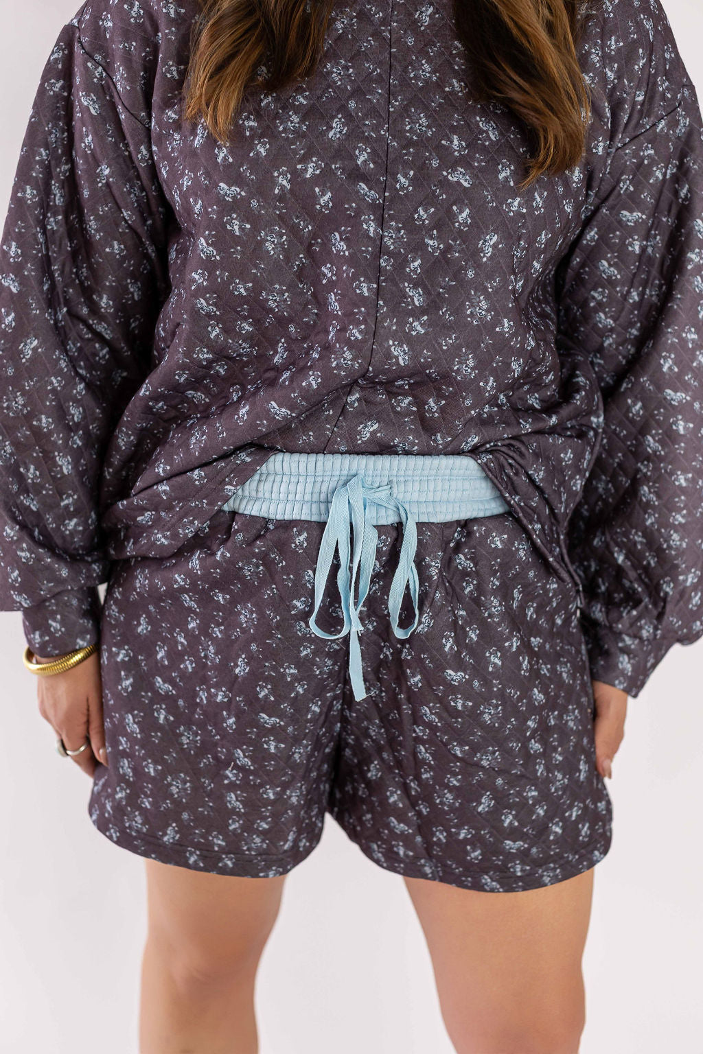 Casual comfort has never looked so cute. The Blue Dusk Floral Quilted Set features a soft quilted pullover and matching shorts in a muted indigo hue with a subtle allover floral print. The relaxed fit and lightweight quilted texture make it perfect for transitioning seasons — cozy enough for cool mornings, yet breathable for daytime wear.
