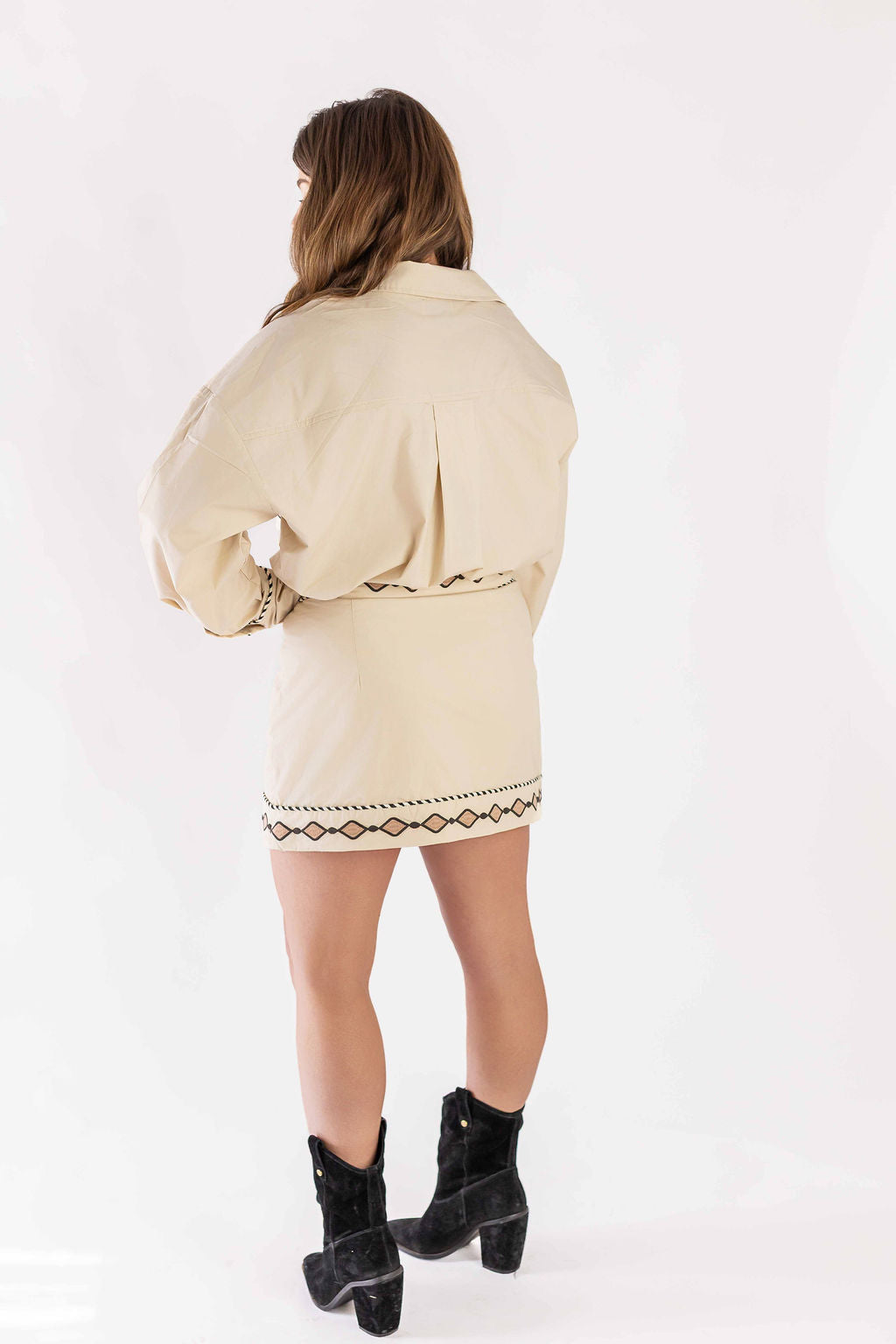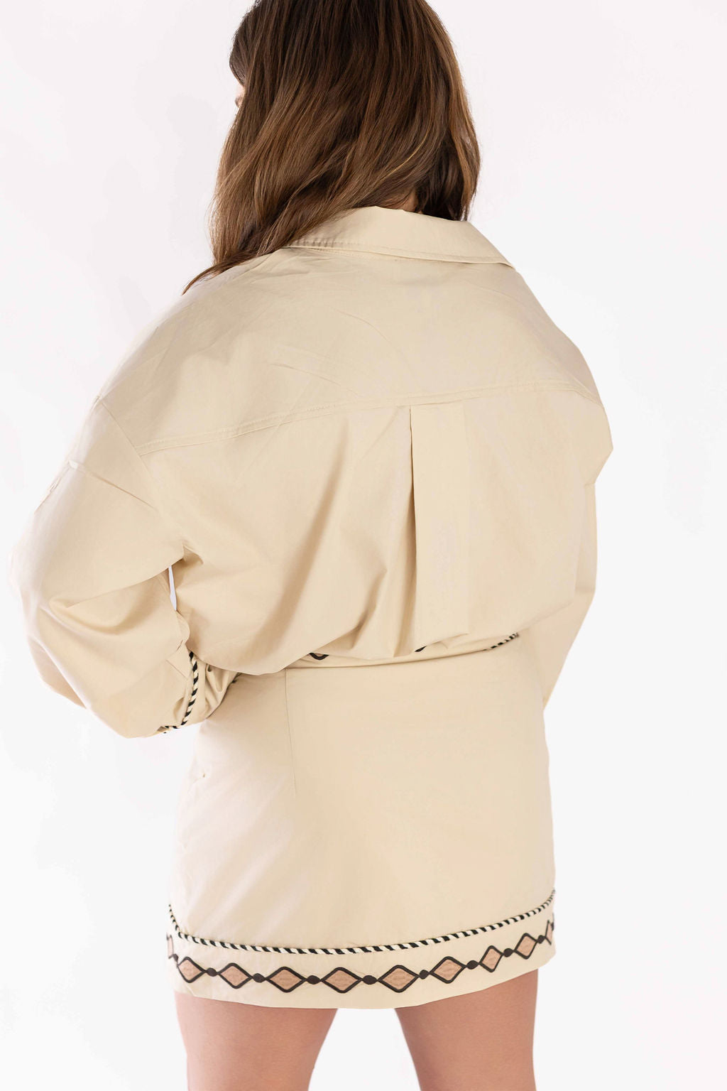 Turn heads in this effortlessly chic matching set featuring bold embroidered floral details in earthy tones. The structured button-down top pairs perfectly with the coordinating mini skirt, both crafted in a soft neutral fabric that brings out the contrast stitching and hand-drawn floral motifs. The skirt’s bordered design adds an elevated boho-classic touch, while the relaxed sleeves and tailored waistline keep the look feminine and flattering.