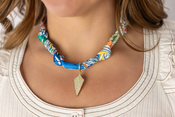 Bright bold and coastal cool the Isla Scarf Necklace features a vibrant blue patterned scarf accented with gold textured beads and a dazzling diamond shaped pendant