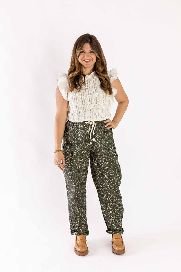 Relaxed, flowy, and effortlessly pretty — the Olive Meadow Drawstring Pants are your new go-to for casual days with a touch of charm. Designed in a soft olive green with a subtle cream floral print, these lightweight pants feature a comfortable elastic waistband with a rope drawstring and tassel detail. The easy, straight-leg fit and side pockets make them as practical as they are stylish.
