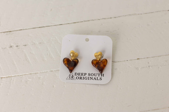 Classic meets bold in the Tortoise Heart Earrings. Featuring a warm tortoise shell heart drop paired with a textured gold heart stud, these earrings offer vintage charm with a modern twist. The rich caramel and brown marbling makes them an eye-catching favorite for fall and year-round styling.