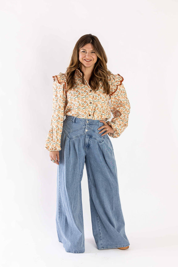 Sweet, feminine, and full of charm — this floral blouse brings a soft vintage feel to any outfit. The corduroy fabric features a tulip-inspired print in peach and sage tones, finished with delicate ruffle trim along the shoulders and cuffs for an elevated boho touch. A button-down front and relaxed fit make it as easy to wear as it is eye-catching.